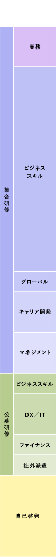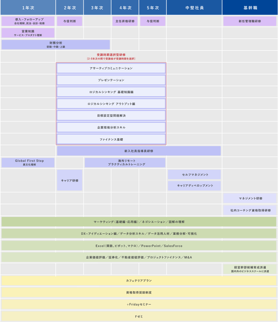 法務、税務、会計知識のほか、ロジカルシンキング、プレゼンテーションスキルなど、社内外の講師により着実な知識レベルの向上とステップアップを図ります。