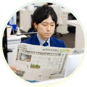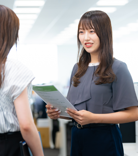 日頃の営業活動で大切にしているのは、訪問前の事前準備です。商談を有意義な時間にするため、ニュースリリースをチェックするなどの基本的な情報収集や、過去の商談内容の振り返りは欠かさず行っています。支店内でも営業活動の状況を共有しているので、同業界のお客様に対する提案事例について、支店の先輩方に教えてもらうことも。支店長からも商談の流れや意識した方がいいポイントについて丁寧にアドバイスをいただけるので、とてもありがたいですね。 私自身はまだ2年目の若手ですが、営業活動の中では経営幹部の方々と商談する機会も増えてきました。経営者の方々は従業員の生活を背負っているという責任の中、広い視野で物事を捉えていると感じます。商談を通じてそうした考え方や業界知識について勉強させていただくことで、日々社会人として成長している実感があります。お客様に一番近い距離で接することができるのが、営業の魅力。これからもさまざまな人と接しながら、知識を吸収して仕事の幅を広げていきたいです。