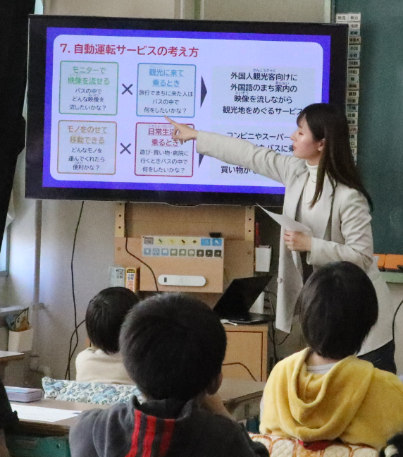 採用面接のときに「モビリティ分野の社会課題を解決したい」と宣言していたこともあり、配属されたのがモビリティビジネス推進部。近年新設されて、まさにこれから新たな事業領域として立ち上げて成長させていこうというフェーズの部署です。 以前、自社のモビリティ事業を社会に広げる取り組みの一つとして、小学生向けに自動運転に関する授業を行ったことがあります。普段行っている自動運転を「使ってもらう」お客様への説明とは異なり、自動運転を「知ってもらい、身近なものとして考えてもらう」ための説明が必要であると考え、工夫をしながら準備を進めました。授業終了後、子供たちからは「よく理解できた、もっと沢山のことを知りたいと思った」と嬉しい感想をもらうことができ、期待以上の結果が得られたと感じます。 そもそもモビリティ分野は技術の進歩が著しく、トレンドの移り変わりが激しい分野。部署全体でも常にトレンドにアンテナを張るように意識しています。実際にモビリティ分野のビジネスに携わりトレンドを追いかけていると、より移動という社会課題について解像度が高まり、視野が広がっていることを実感します。得た知識は自分だけに留めるのではなく、業界の状況を一覧できるマップにまとめて部署内に共有。自分の知識の整理と共に、部署全体の知識の底上げに貢献できるように努めています。