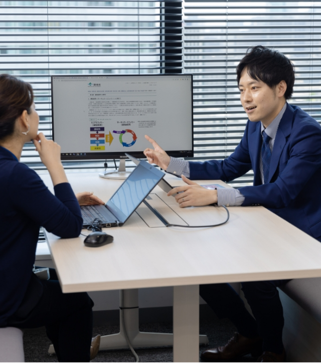 もともと私自身、スケールの大きなことや高いハードルにチャレンジすることに喜びを感じるタイプ。入社以来、福岡支店や現部署のコーポレート営業第一部、いずれでもそのような挑戦の機会が多く、充実していますね。 特に規模が大きい案件になると、役員や各事業領域の専門営業部など関係者が増えていきます。その中で、どんな課題解決のシナリオを描くのか。それは、お客様と最前線で向き合っている営業担当の仕事。先輩方や専門部署の方々から知見をお借りしながら、常に先を読み、ゴールへのシナリオを描いていく。そんな大きなスケールとチャレンジングなミッションが今の仕事のやりがいです。 大企業のお客様は、法改正や社会情勢の変化など外部環境に応じて事業を変化させていくことも少なくありません。社会のトレンドに目を向け、お客様に寄り添った提案ができる営業マンになれたらと考えています。お客様が何かビジネスを始める際の最初の相談窓口になることが今後の目標です。